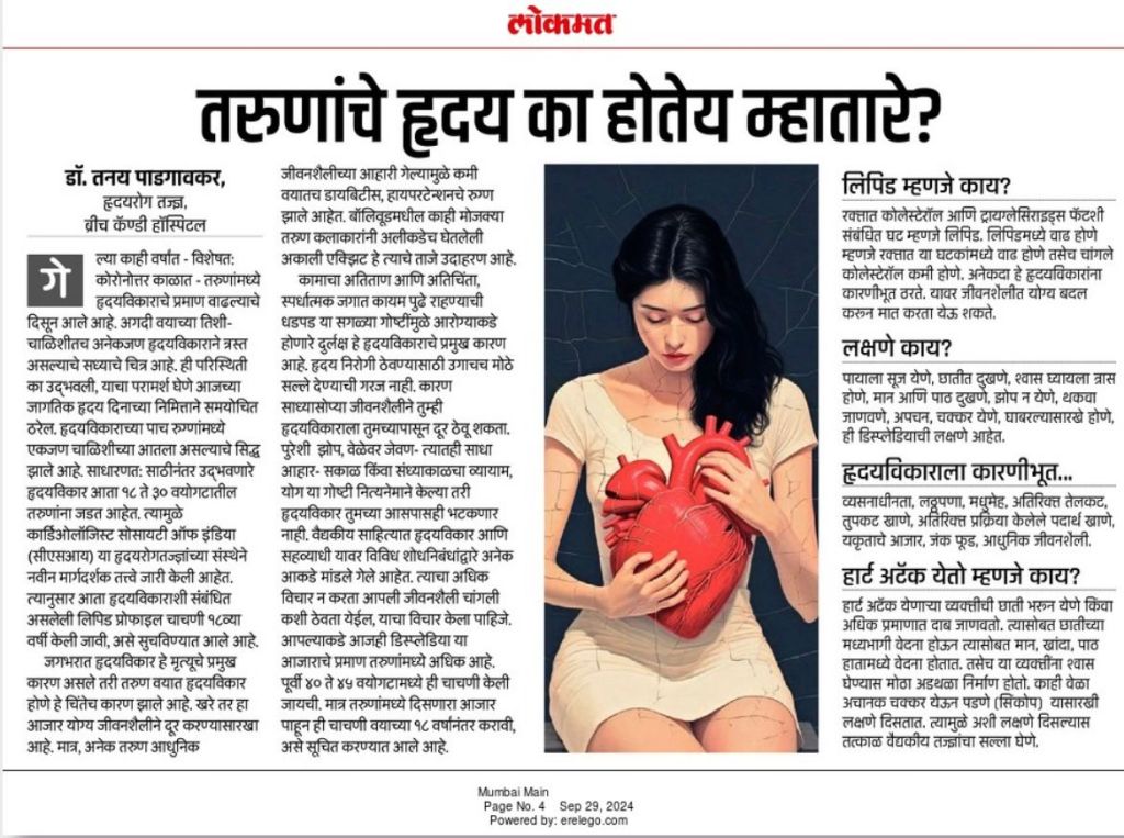 Media Dr. Tanay Padgaonkar presenting one of his complex angioplasty cases at a national webinar for cardiologists organised by Abbott Vascular. Times of India Article on Silent Heart Attack by our Interventional Cardiologist Dr. Tanay Padgaonkar. Lokmat Article published by Dr. Tanay Padgaonkar about Heart Attack Bombay Times article on Primary Angioplasty and benifits of early care for a Heart Attack Share this:Tweet Click to share on WhatsApp (Opens in new window) WhatsApp Click to email a link to a friend (Opens in new window) Email Like Loading...